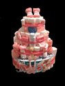 It includes: 2 pairs of socks, 2 pacifiers, 2 spoons, 1 johnsons travel pack, 2 recieving blankets,4 bibs, 6 face clothes, 2 travel baby wipes All 3 layers are size 1 diapers (about 100) CAKES COME WRAPPED IN A CLEAR PLASTIC BASKET BAG