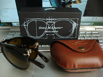 Stainless Steel Persol Arrow logo on each side. Italian made Steve McQueen Persol Leather case (for 714 SM), Persol Dustcloth & all papers included.