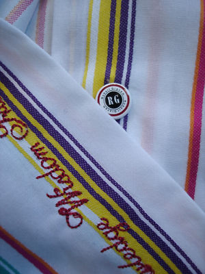 Classic Fit. Woven Shirt. Semi-spread Collar. Collar stays included. 2 Button Cuff. Multicolored Textured Stripes. Multicolored Silk trim inside neckline & outer neckline and on hem vents. Blue RG Crest embroidered on