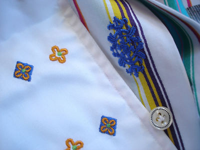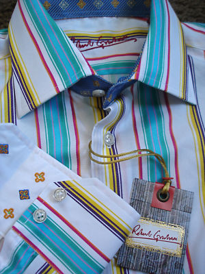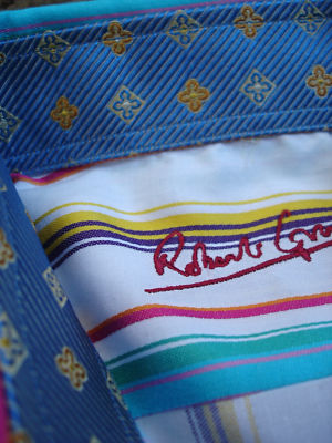 inside placket between the 2nd and 3rd buttons. Multicolored embroidered design inside cuffs. Robert Graham is