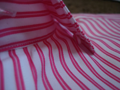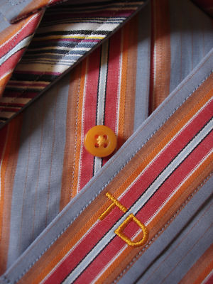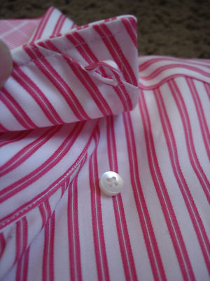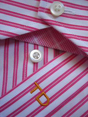 Dark Pink & White Textured Striped Pattern. Dark Pink & White Plaid Pattern inside neckline & cuffs. Orange TD embroidered on bottom of placket. Orange last button and button hole stitching.
