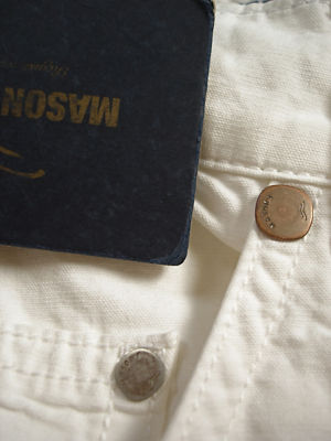 MASON's engraved on bronze button. Antiqued copper & pewter rivets. 5 Pocket styling. Straight Leg. 1 Button closure. Zip Fly. Locker Loops with Guaranty/Authenticity Numbers. Mason's stitching on back pockets.