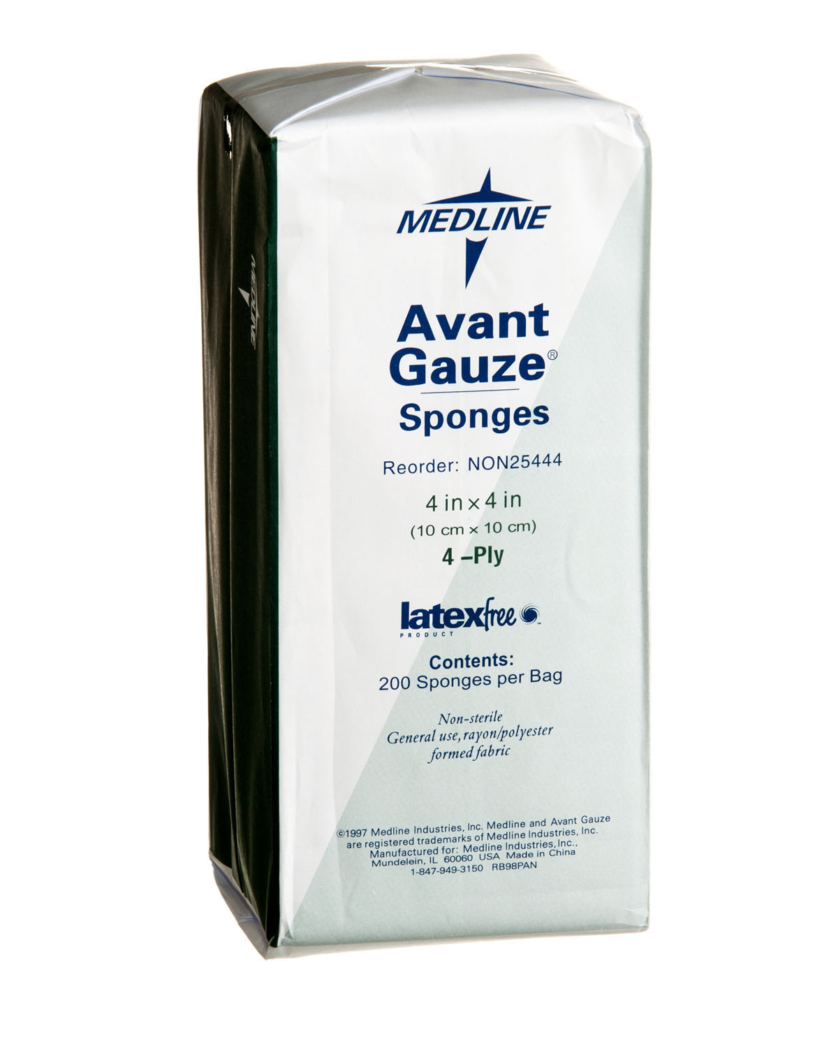 Medline Avant Gauze: Avant Gauze is Medline�s standard non-woven dressing. Compared to traditional cotton gauze, Avant Gauze produces less lint and is less traumatic to fragile granulating wound tissue because it�s virtually non-adherent. It also has significantly faster wicking ability which promotes a healthier healing environment. Discover the perfect balance between strength and absorbency in this rayon/polyester blend gauze. Non-Sterile 4 inches x 4 inches, 4-ply. 1 PK as 200 EA / PK, 1 PK / PK, 10 PK / CS.