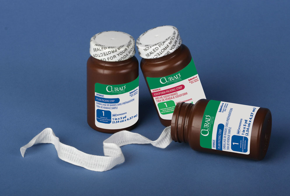 Packing Strips: These tightly woven 100% cotton gauze packing strips are ideal for sterile drainage of open and/or infected wounds. Available plain, or with iodoform. All are packaged one strip per bottle, sterile. Plain ' 1/4 inches x 5 yd. 1 CS as 12 EA / CS, 1 CS / CS.