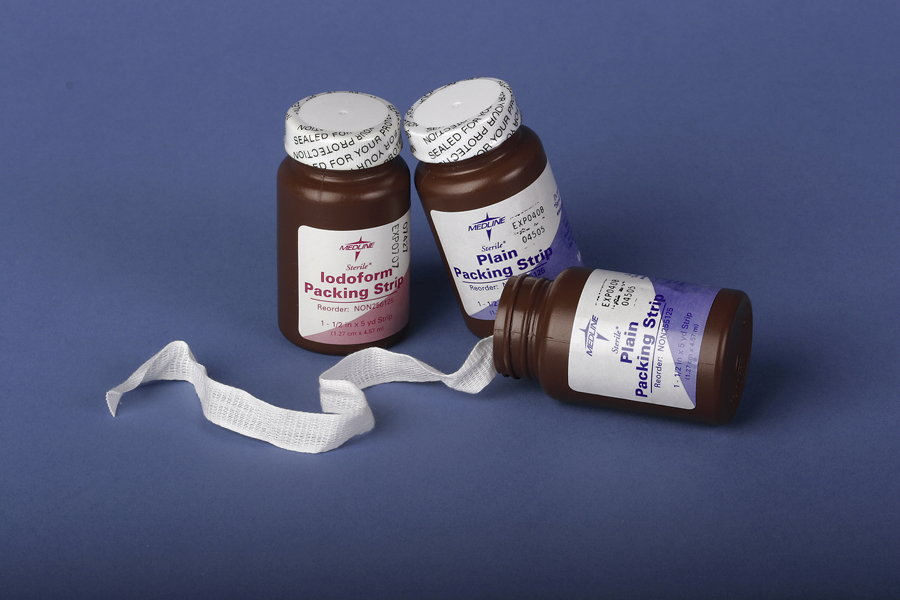 Packing Strips: These tightly woven 100% cotton gauze packing strips are ideal for sterile drainage of open and/or infected wounds. Available plain, or with iodoform. All are packaged one strip per bottle, sterile. Plain ' 1/2 inches x 5 yd. 1 EA as 1 EA / EA, 12 EA / CS.