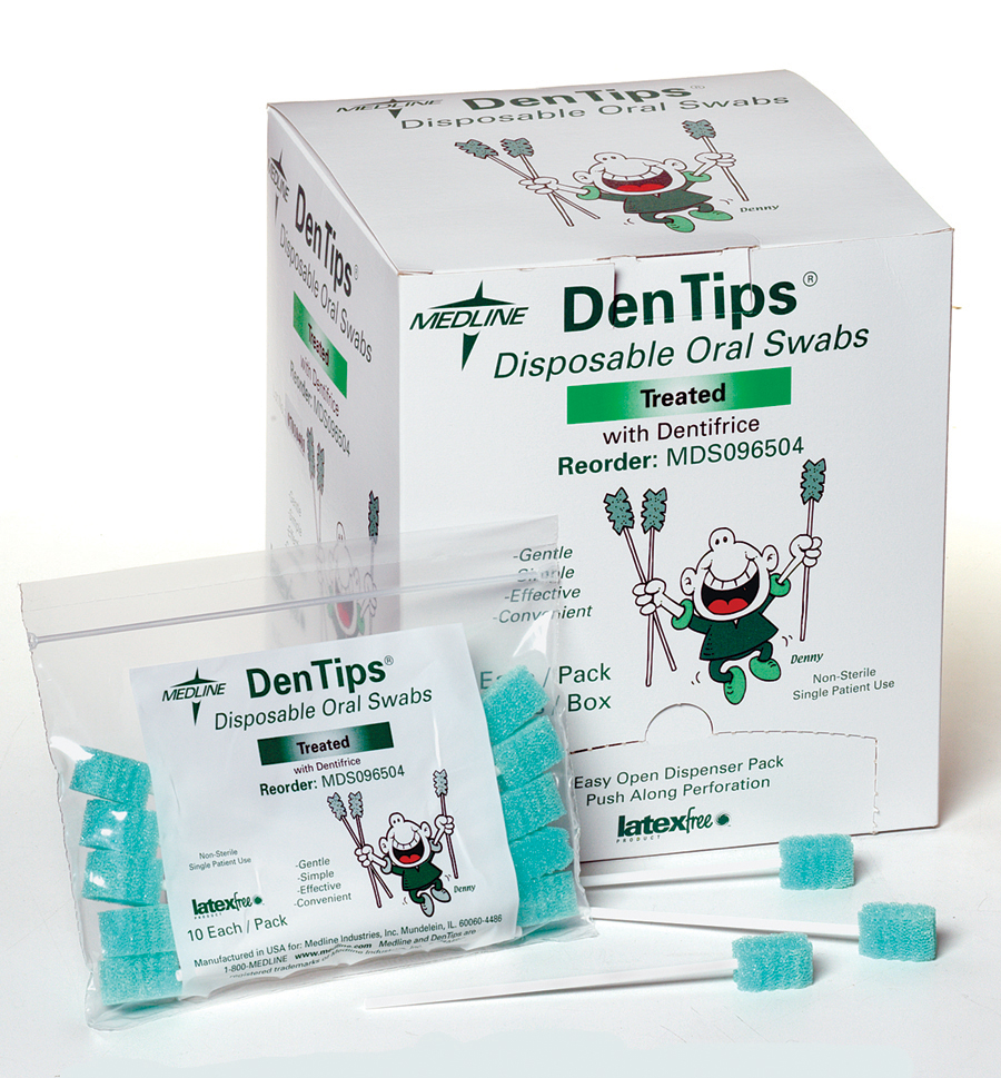 Dentips Disposable Oral Swabs: Medline's disposable oral swabs feature a color coding system for Treated (green) or Untreated (blue) swabs. The swabs are made of long plastic handles to help prevent touch-contamination. Product is available in a variety of packaging options, including resealable bags and convenient dispenser packs, to meet clinical needs. Ideal for use with Biotene products Treated with Dentifrice (Mint flavored) - Green Individually Wrapped. 1 CS as 500 EA / CS, 2 BX / CS, 1 CS / CS, 1 CS / CT.
