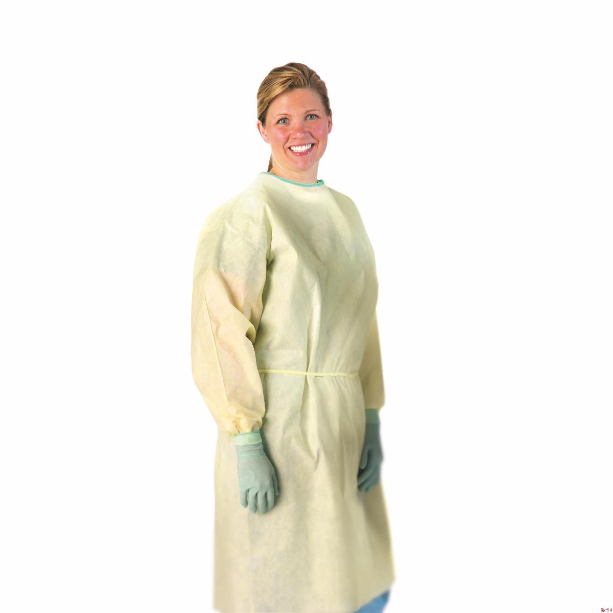 Medline's Medium-weight breathable gowns. Medline's classic Medium-weight gowns are generously sized for full coverage and flexibility. These gowns offer protection against fluids under light to moderate pressure conditions. The gowns are generously sized and feature non-restricted elastic wrists. The long waist ties and tape tab neck closure ensure secure fit. Gowns feature strong sealed seams that are designed to withstand even rough treatment, offering 360� total protection. The gowns are made from Medium-weight yellow, multi-layer non woven material meet AAMI PB70 level 2 testing. Medline's AAMI level 2 gowns feature a green color coded neck binding. Elastic wrists, tape tab neck flat pack, 10/bag. Regular/Large size 1 CS as 100 EA / CS, 1 CS / CS, 1 CS / CT.
