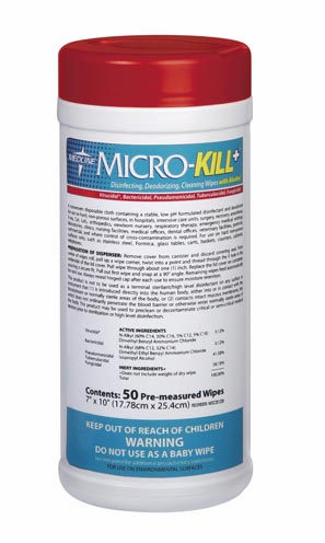Medline Micro-Kill+ Wipes Effective Against MRSA, VRE, and Other Common Viruses in Two Minutes. These EPA-registered wipes are available in five sizes - from single-use packets to OR-sized canister wipes - to meet your germicidal cleanup needs. Alcohol-based Medline Micro-Kill+ wipes are tough too. Their fabric stands up to hard-surface scrubbing and contains enough liquid to ensure maximum surface coverage. 7 inches x 10 inches (18cm x 26cm), 50 ct, smaller canister 1 CS as 1 CS / CS.