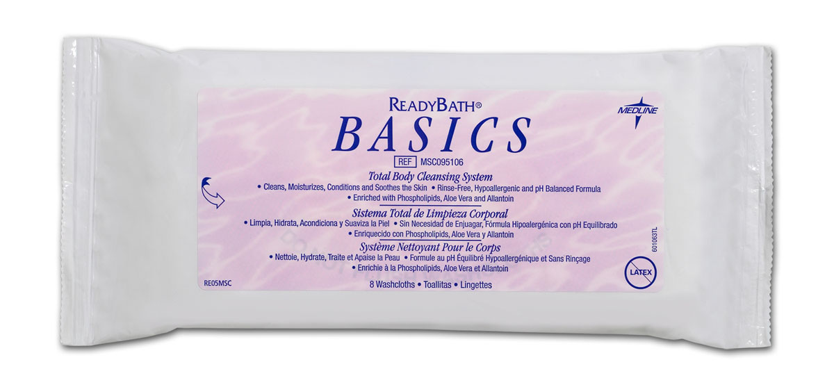 ReadyBath Basics: ReadyBath replaces the numerous products needed for soap and water bathing with one, easy-to-use package of pre-moistened, pH balanced and hypoallergenic washcloths. ReadyBath improves skin care by eliminating harsh soaps, washcloths and towels that are known to damage the skin. It contains special moisturizers that improve skin condition. Scented, 8 Cloths/Pack, 30 Packs/Case, Resealable. 1 CS as 30 PK / CS, 1 CS / CS.