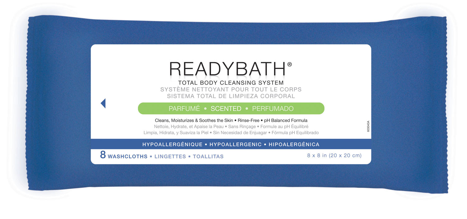 ReadyBath Complete: These soft cloths are pre-moistened with gentle, pH-balanced solutions that clean, moisturize and condition the skin. They may be used at room temperature or warmed for patient comfort. Each tamper-evident pouch contains premoistened single-use washcloths so that each body zone can be cleaned with a separate cloth. Scented, 8 Cloths/Pack, 30 Packs/Case, Resealable. 1 CS as 30 PK / CS, 1 CS / CS.