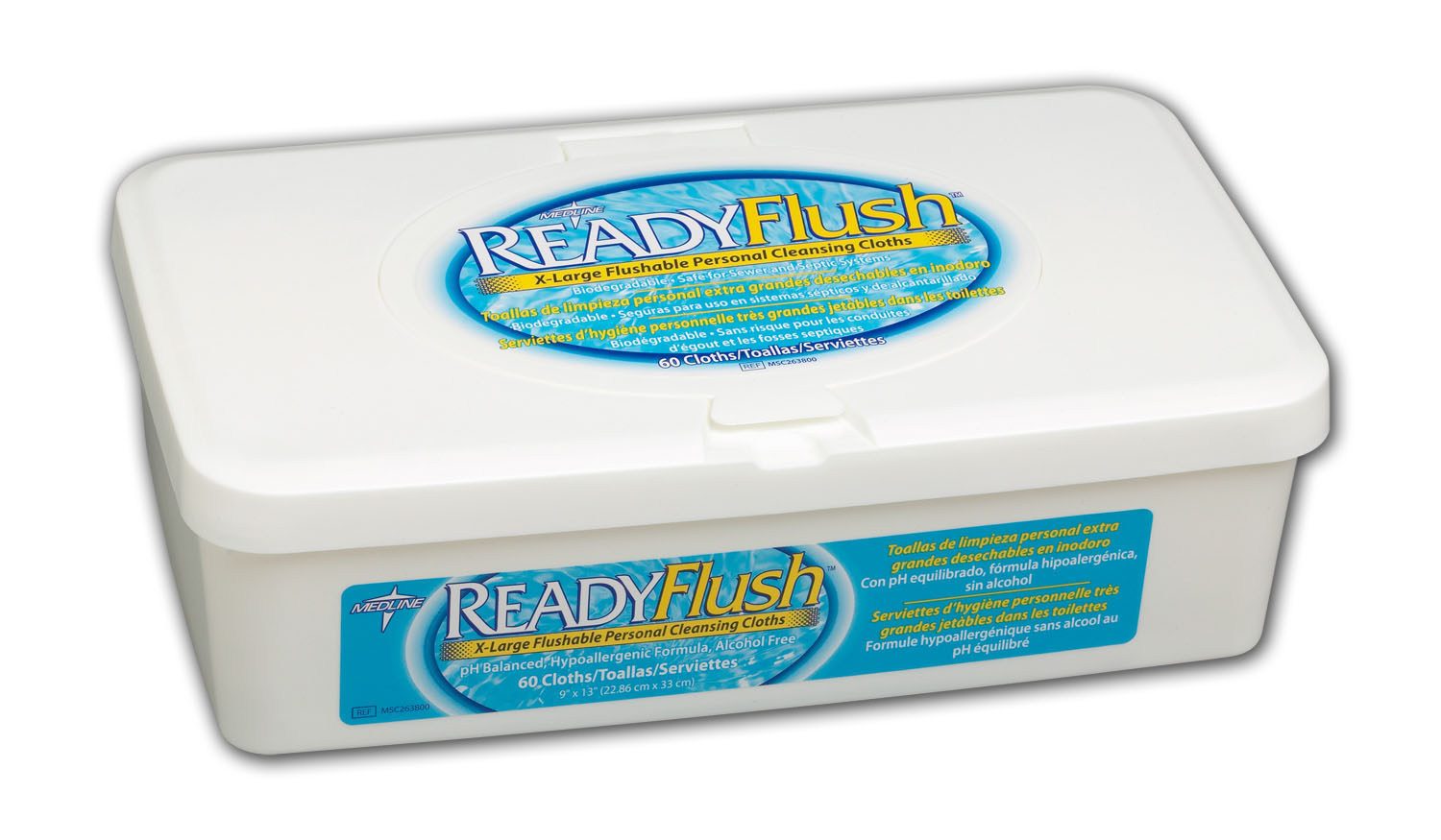 ReadyFlush� & ReadyFlush� Jr.: The first truly flushable & dispersible healthcare wet wipe. All ReadyFlush wipes are made from 98 percent cellulosic fibers, which are highly biodegradable. These fibers break down quickly when flushed, yet are still strong in use. The wipes' gentle cleaning solution is kind to skin. A dimethicone formula is available for extra skin protection, and you can choose from scented or fragrance-free. Junior size also available for those smaller jobs. Tub, no dimethicone, scented. 60-ct. tub/9 tubs per case. 9 inches x 13 inches (23 x 33 cm). 1 CS as 9 PK / CS, 1 CS / CS.