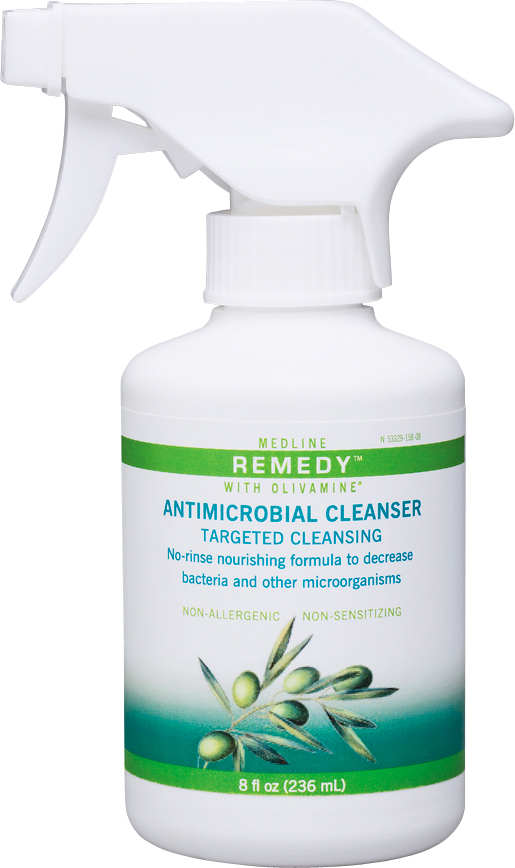 Remedy 4-in-1 Antimicrobial Cleanser: Remedy 4-in-1 Antimicrobial Cleanser cleanses, moisturizes, helps provide protection against microorganisms and nourishes the skin in one step. Aids in reducing odor. Optimizes shelf space and nursing time. Contains benzalkonium chloride to help protect against microbial contamination associated mainly with perineal and peristomal care. Also, aids in reducing odors associated with excessive bioburden. Harsh soaps and surfactants strip skin of moisture and contribute to TEWL. Remedy 4-in-1 Cleansers have a phospholipid base that binds both water and nutrients to gently clean and condition the skin. Remedy cleansers contain ingredients derived from natural and organic oils that mimic the body's natural lipids. Remedy cleansers can also be used during showers in place of soaps. The phospholipids will gently cleanse the skin without stripping it from its natural oils. Olivamine is a blend of antioxidants, amino acids, vitamins and methylsulfonylmethane (MSM). These ingredients are all known to play a vital role in basic cellular construction and protection. Olivamine contains antioxidants like hydroxytyrosol, the most potent antioxidant known today (derived from olives). It also contains amino acids like L-proline, L-cysteine and glycine - three of the main building blocks of collagen. These components are also treated with photoacoustic resonance to help minimize the tendency for inflammation, and to ensure they can be rapidly accepted by the skin. Antimicrobial Cleanser, 8 oz. 1 CS as 12 EA / CS, 1 CS / CS.