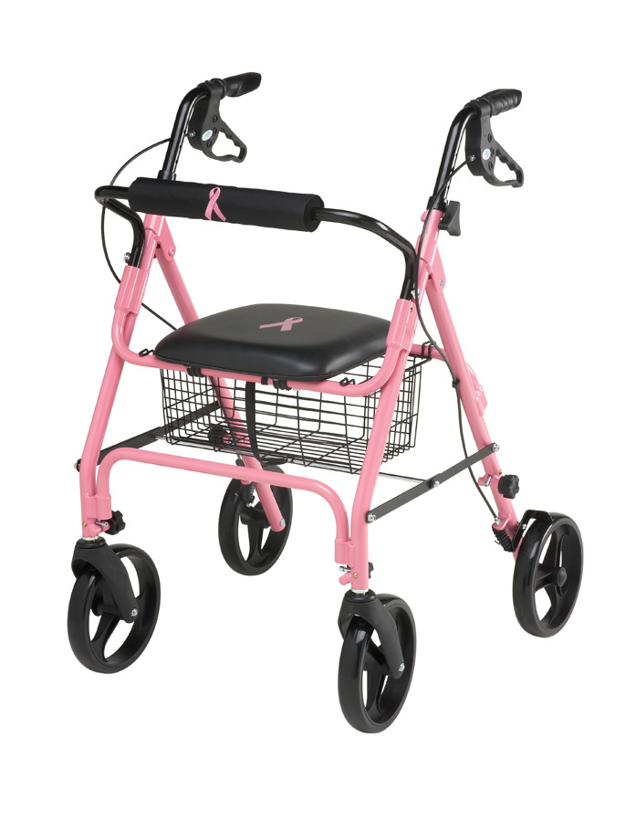 Breast Cancer Awareness Rollator: Comfortable padded seat - 12 inches wide x 12 inches deep with loop brakes - pull to stop, push to lock. Height adjustable handles adjust from 31.5 inches high to 37.5 inches high. The attached basket beneath the seat provides security yet is easily removable to carry with you. Weighing only 15 pounds it's lightweight aluminum makes transporting easy. 300 lbs weight capacity. 1 CS as 1 CS / CS, 1 CS / EA.