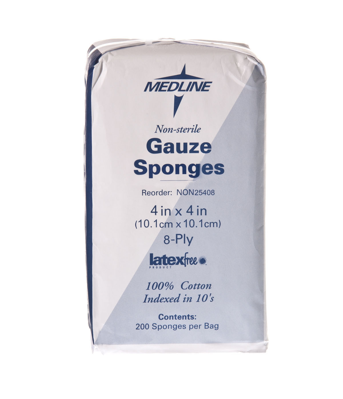 Medline 100% Cotton Woven Gauze Sponges: These USP Type VII cotton sponges are ideal for wound dressings, wound packing and general wound care. Our strictly controlled manufacturing process assures clean, debris-free packing with folded edges to prevent unraveling. Non-Sterile 4 inches x 4 inches, 8-ply. 1 PK as 200 EA / PK, 1 PK / PK, 20 PK / CS.