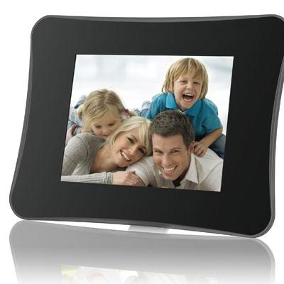Show off your photo memories with the DP860 in this sleek contemporary frame, featuring a glossy black design and a vibrant 8" LCD screen. Set your photos to music with MP3 audio playback and watch your favorite digital home videos. A full-size USB port and multiple memory card slots allow for quick and easy viewing. Integrated speakers, calendar and alarm clock functions also included. 8" TFT LCD color display Contemporary-style frame Displays JPEG photo files Plays MP3 and WMA music files Plays MPEG-4, H.264, and Motion JPEG video files Photo slideshow mode with music Calendar and clock with alarm timer SD, MMC, MS, xD, and CF card slots Full-size USB port for use with flash memory drives Integrated stereo speakers Full-function remote control included Wall-mountable design with detachable stand