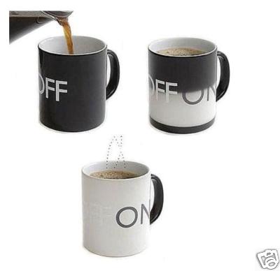 Item Description This product made us laugh when we first saw it! at plain sight it is a standard black mug as they come a dime a dozen and in bit white letter is say OFF. Nothing fancy, but once you add the hot beverage of your choice, the mug changes color and is turning white and in big black letters it states: ON.