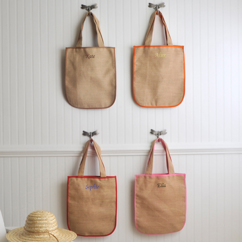 Our stylish and earth friendly personalized Southampton Jute tote lets you go to the beach or farmer's market in style. Don't let the slim, simple design fool you! There's plenty of room in the spacious main compartment for all your daily essentials. Made from sustainable natural jute fiber, the bag and handles are cotton lined for comfort. Choose from one of our four lining colors and 15 signature thread colors. Bag measures 13 1/4" x 16". Select Perfect Pink, Chocolate, Orange or Red lining. Personalized with up to seven characters in thread color of your choice.