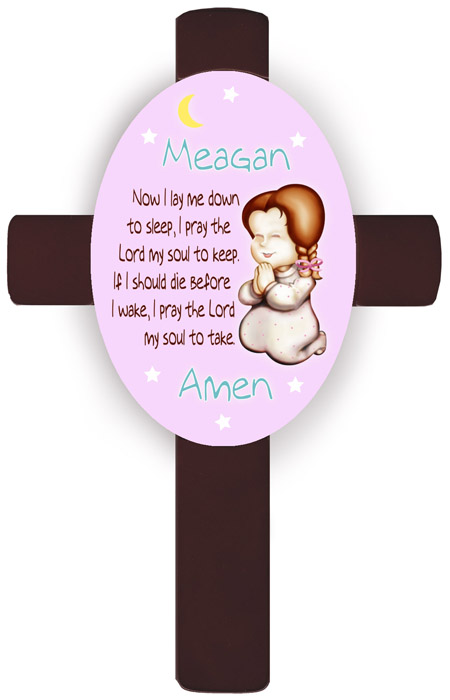 Wish your favorite little one blessings for a good nights sleep with our Personalized Girl's Prayer Cross. This wooden cross features a sweet little girl with brown hair with hands folded and eyes closed, ready to recite her bedtime prayers. Choose from two familiar prayers and personalize the wall cross with the childs name for an added special touch. Cross measures 11" x 7" x 3/4".