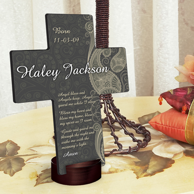 Celebrate a special religious landmark in the life of a loved one with this handsome grey and white personalized paisley cross. Especially suitable for a boy or young man, this christian cross features a choice of nine prayers and includes the name of the recipient in a masculine font. Printed on long-lasting composite material. Includes stand for more display options. Stand included. Cross measures 6 3/4" x 5 1/8" x 1/4". Stand measures 1 3/4" in diameter and stands 3/4" tall. Select prayer and personalize with a name of up to 20 characters, an event of up to 15 characters and date (MM-DD-YY format).
