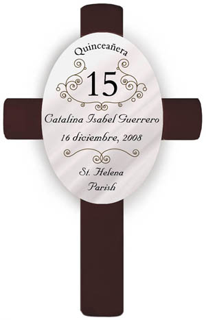 Help celebrate her transition from childhood to womanhood by commemorating that special girls Quinceanera with a unique personalized gift. This wall cross is fashioned in rich wood tones, adorned with an attractive wood composite oval with filigree design, bearing the name of the honored guest, the date of the event, and her home parish. Cross can be printed in English or Spanish (please enter personalization information in preferred language). Cross measures 11" x 7" x 3/4".