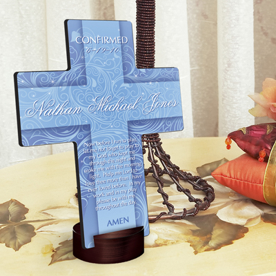 Decorated with delicate swirls and sparkling bursts of light, our personalized Twinkling Star Cross is the ideal addition to a nursery or young persons room. Made of a long-lasting composite material, this pretty wall cross will be a long-treasured gift. Choose from nine poems of faith suitable for a variety of occasions. Stand included. Cross measures 6 3/4" x 5 1/8" x 1/4". Stand measures 1 3/4" in diameter and stands 3/4" tall. Select prayer and personalize with a name of up to 20 characters, an event of up to 15 characters and date (MM-DD-YY format).