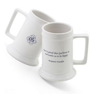 Whether he prefers a pale ale, smooth lager or hearty stout, he'll enjoy watching the foam rise on his very own personalized beer stein. One side is imprinted with a single-initial monogram. The other side features your choice of 8 different quotes--from the great minds of Ben Franklin to W.C. Fields. Each heavy-duty white ceramic mug holds 16 ounces of your favorite beverage. Cheers! Specify quote and a single initial. A personalized gift any beer drinker will enjoy.