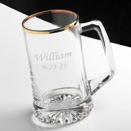 Remember your next occasion every time you drink from this personalized mug filled with your favorite beverage, one step up from the pub with its stylish gold rim. The personalized gift holds 25 fluid ounces. Personalized with two lines of up to 15 characters per line.