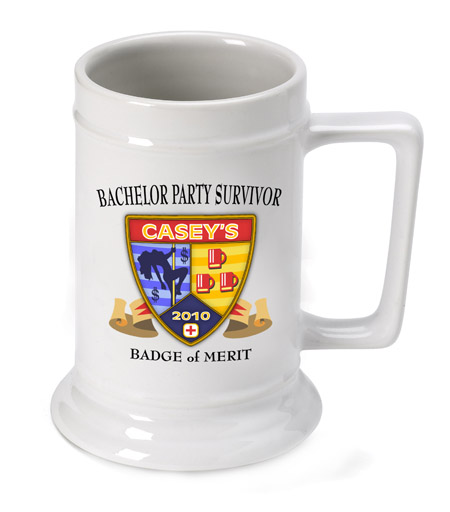 Award your bachelor party attendees or groomsmen with this hilarious stein, offering a merit badge for making it through that famous pre-wedding ritual. The colorful insignia includes all the vices of a traditional bachelor party and features the name of the groom and year of the wedding. Great personalized gift for the groom, too! Holds 15 ounces. Personalize with groom's name and year. Enter punctuation as desired. Name will print in all caps.