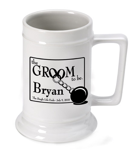 Share a few chuckles with the soon-to-be groom with our whimsical "Groom to Be" beer stein. The clever "ball-and-chain" image warns him of things to come and predicts the end of life as he knows it. Add a wedding date and the groom's name for a unique personalized gift that he'll treasure for years...unless it mysteriously disappears! Perfect pre-wedding or bachelor party gift! Holds 16 ounces. Personalize with groom's first name and wedding date.