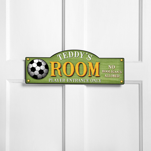 Give a nod to one of the world's most popular sports with this soccer-oriented personalized room sign, proclaiming "No Hooligan's Allowed". Ideal for players of all ages, it makes a great addition to the team room, a boy's bedroom, or even the family den. Background is green faux-wood and room for a name is included.