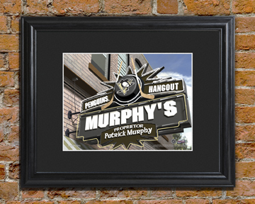 Don't wind up in the penalty box! Buy your favorite hockey fan this unique personalized NHL Pub Sign, featuring the name and official logo of his/her beloved NHL team. The sign, framed and matted in black, also includes the name of the recipient and dubs him/her proprietor of the favored local hangout for fellow hockey fanatics. Great for home or business, this personalized sign makes a perfect gift for a variety of occassions. All NHL teams available. Includes a custom black, beveled 23" x 19" wood frame and 3" mat with acrylic front, it matches any décor. Photo measures 13 3/4" x 11 3/4". Personalize the Pub name with up to 12 characters and add the proprietor's name of up to 18 characters.