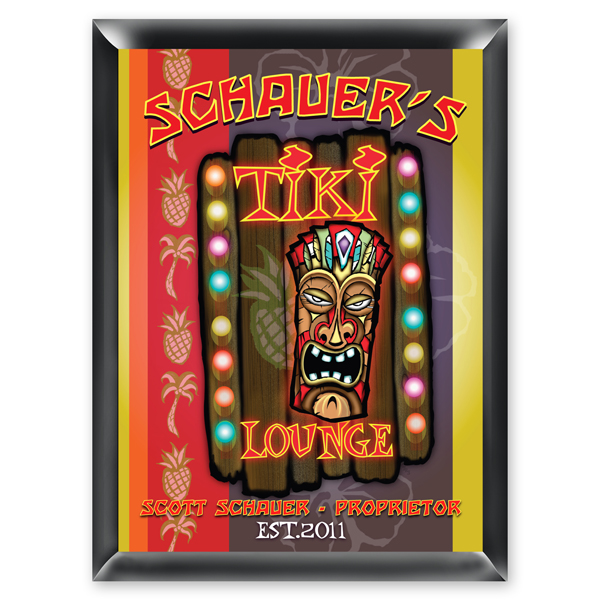 Everyone is welcome at the "Tiki Lounge". The Tiki Lounge sign explodes with color and rich tropical imagery. This personalized gift brings a little bit of the tiki spirit to your home bar. The design is printed directly onto the wood base for lasting quality. Measures 9" x 12". Personalized with first name, last name and established year.