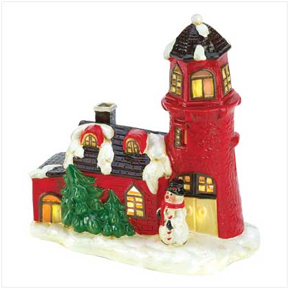 Create a dream scene with a storybook theme! Quaint lighthouse cottage glows cheerily from every window and door when you tuck a tealight inside. A holiday heart warmer! Weight 1.2 lbs. Ceramic. Candle not included. 6?" x 4?" x 7" high.