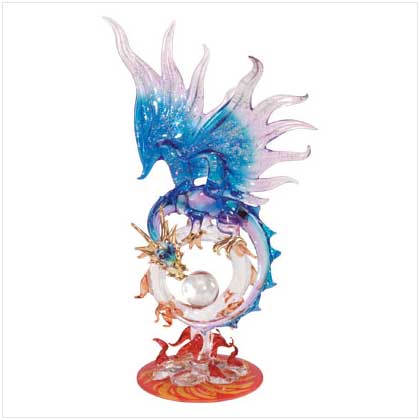 A midnight-blue and gold-trimmed dragon zealously guards his precious orb from the swirling crimson flames of the netherworld in this stirring mythic monument crafted in glass. 6" x 4?" x 10" high.