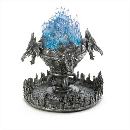 A trio of guardian dragons overlook the medieval kingdom below, while cradling a crystalline cluster that sends a mystical mist into the air. Polyresin. UL Recognized 11¬" diameter x 13¬" high.