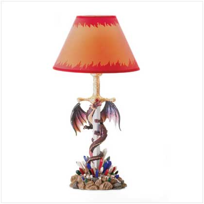 A dragon wraps his serpentine shape around the blade of a sword, lit from above through the flames on the lampshade! Set the mood for mystery and magic! Max. 40-watt bulb not included. UL Recognized 7" x 6" x 21«" high; Lampshade: 11" diameter x 7" high.