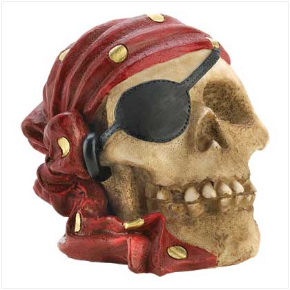 Tuck this tiny Jolly Roger where he?s sure to give a thrilling chill to all who behold! Display your pirate spirit with pride; this bandanna-bedecked fellow cheerfully keeps you company with his ghastly gap-toothed grin. Sure to shiver your timbers! Polyresin. 3«" x 3?" x 3«" high.