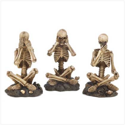 Terrifying skeleton triplets act out a famous fable, placing bony hands over eyes, ears and mouth. A spooky reminder to never see, speak or hear evil that no one will dare to disobey! Weight 0.5 lb. Polyresin. Each is approximately 2" x 2" x 3?" high. Set of 3