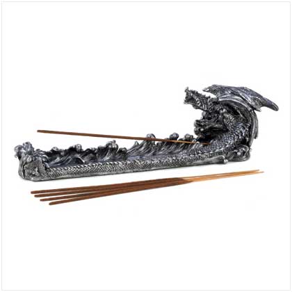 Drifting incense smoke curls around the wings of a crouching medieval dragon, creating a startlingly realistic miniature storybook scene. This richly detailed sculptural incense burner brings the wildest fantasy fiction to life! Weight 0.8 lb. Resin. Incense sticks not included. 3«" x 12«" x 4" high.