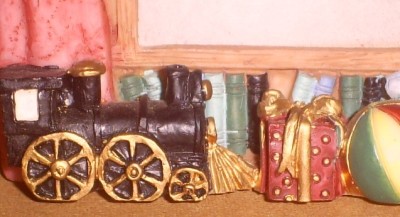 A really lovely item, with a molded teddy sitting on some steps in front of a bookcase/window reading a book, surrounded by various other toys.