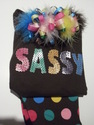 This particular bow is a MTM Circo "Sassy" outfit with 6 colors that match each color on the pants with circles.
