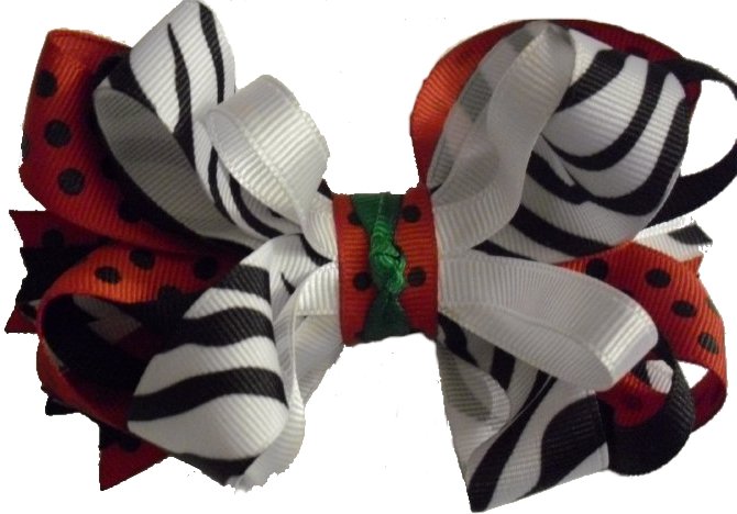 Layered Zebra, Black & Red Polka Dots with a splash of green grosgrain ribbon. I made this to match my daughter's Zebra print pillowcase dress with a Watermelon on the front... it looks spectacular