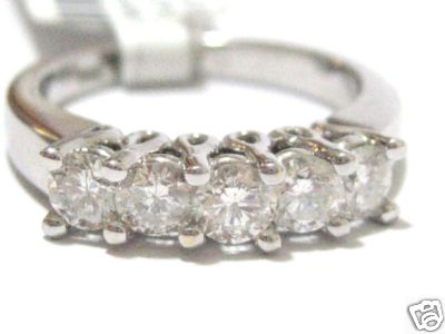 There are 5 22-24 pt Natural Diamonds ( mined from the earth) that are VS2-SI2 in Clarity and G/H in Color. There are all RBC, Round Brilliant Cut Diamonds. PLEASE DO NOT JUDGE THE RING BY ITS POOR PHOTOGRAGH, THE RING IS MUCH SHINIER THAN THE PICK. IT HAS THICK GOLD BAND, SOLID 14K WHITE GOLD.
