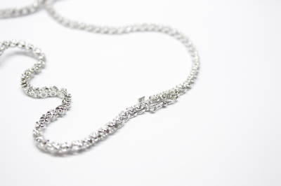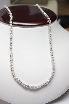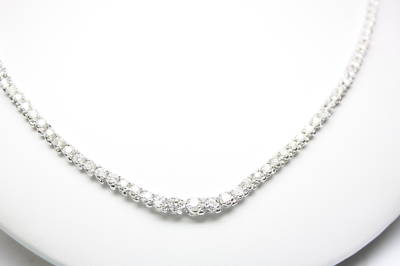 YOU ARE LOOKING AT A GORGOUS 6.98 CT TENNIS/ ETERNITY NECKLACE. EACH STONE ARE FULLY CUT AND IS SET 4 PRONG SETTING ON A 14K SOLID WHITE GOLD. THE NECKLACE HAS A BEAUTIFUL U SHAPE DESIGN AT THE CENTER. THE LENGHT OF THE NECKLACE IS 18 INCHES OR 45 CENTIMETERS. IT WEIGH 22.3 GRAMS. THE DIAMONDS ARE J-K COLOR AND SI2-I1 EYE CLEAN QUALITY. THIS NECKLACE CAN BE WORN WITH ANY WHITE GOLD DIAMOND JEWLERY SET. IT WAS MADE FROM SCRATCH. THE RETAIL VALUE OF THIS BEAUTY IS $22,000, BUT WE ARE GOING TO SELL IT AT WHOLESALE PRICE. WE ARE THE DIRECT IMPORTER OF DIAMONDS AND FINE JEWELRY. IF YOU NEED A APPRAISAL FOR THIS NECKLACE PLEASE LET US KNOW AFTER YOU MAKE THE PAYMENT. THIS NECKLACE COMES IN A BEUTIFUL VELVET BOX AND YOU PAY NO SHIPPING. THANK YOU AND GOODLUCK.