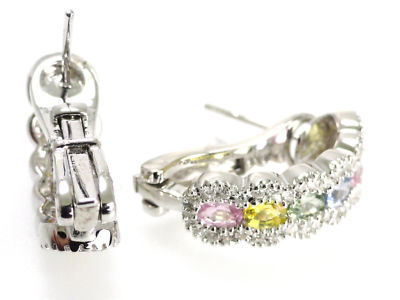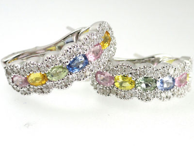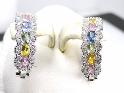 I AM OFFERING YOU THIS GORGEOUS, VERY MODERNISTIC, UNIQUE , AND VERY ORNATE 14 K WHITE GOLD (STAMPED) EARINGS. 12 GORGEOUS OVAL SHAPED GENUINE PINK SAPPHIRE, AFRICAN GREEN AMETHYST, GOLDEN CITRINE, AND BLUE CEYLON SAPPHIRES STONES , ALL BEZEL SET IN A FABULOUS SHARE SETTING. THESE STONES ARE ACCENTED WITH 84 GENUINE FULL CUT ROUND DIAMONDS. EACH COLOR STONES ARE .15 CT THAT ADDS UP TO 1.80 CT AND THE DIAMONDS ARE .50CT H SI1.IF YOU ARE LOOKING FOR A LOVLY GIFT FOR HER, THIS CAN BE A UNIQUE PRESENT. IT COMES IN A VELVET JEWLRY BOX FREE PLUS FREE SHIPPING. |