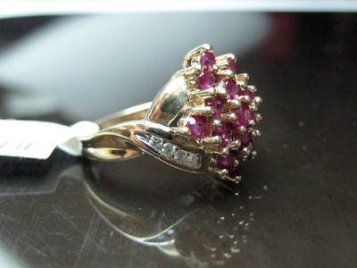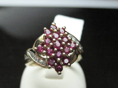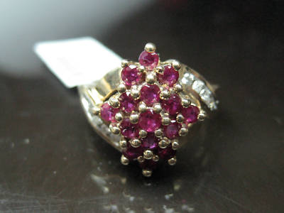 You are looking at a 1.10 ct GENUINE RUBY and diamond ring. These beautiful stones are set on a solid 10k yellow gold (stamped). The ring is very well polished and you can add it to your beautiful selection. Not only is this ring full of luster and briliance, but it is been set in cluster form. if you look throughout the internet, you will not find another ring like this one. very unique and stylish. The color of the diamonds are G-H color and SI1 clarity. The ring is currently size 7 and can be resized for free upon request. Retail suggested price of this ring is $1,100, but you always get your jewelry at a fraction of price @ Agacci Diamonds. thank you and good luck!