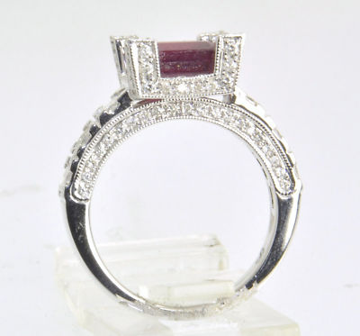 The ring displays finest workmanship all through the mounting with elegant pierced work. Over the crown is set an antique PRINCESS CUT ruby solitaire of rich intense BLOODY red with plenty of silk inside and totally natural ruby