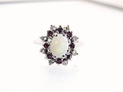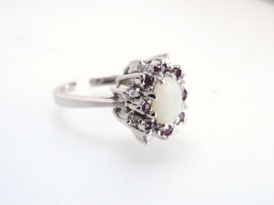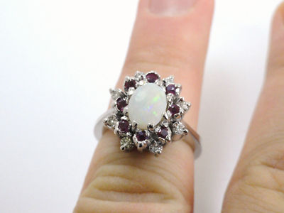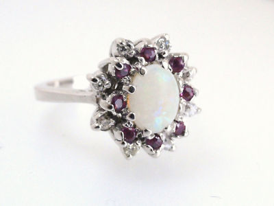 This is a very high quality one-of-a-kind Solid ring - NOT the doublet or triplet material offered by many other Ebay Sellers - customers can be confident they are buying the highest quality goods at the best prices! Stone: Solid Australian Opal, approx 1.63 carats. Setting: 18 Karat White Gold, 8 round cut diamonds, approx 0.05 carats each for a total diamond weight of 0.40 carats. 8 round cut Burma Ruby, approx .05 CT each for a total weight of .40 CTs. Ring Size: 7 (can be resized if needed) Total Weight: Heavy weight of 8.1 grams.