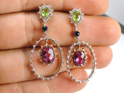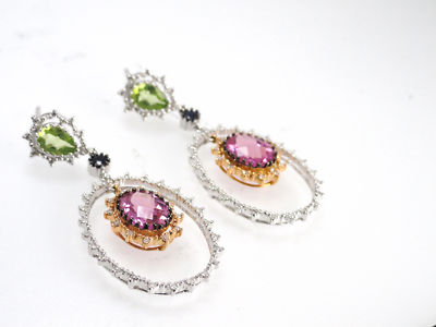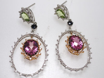 Stunning 18k white gold diamond, peridot, sapphire and pink topaz chandelier earings. Each earing is stamped 18k and its covered in 44 diamonds, 88 diamond total of diamonds. the total weight is 5.00 CT and it weigh 7.6 grams. You have 2 pear shape peridot, 2 round cut blue sapphires and 2 oval cut pink topaz. They are really shiny sparkly and beautiful. Brand new peice, can be given as a gift for holidays. The suggested retail price of this beauty is $3,096. please feel free to ask me any questions. Thank you for looking!!