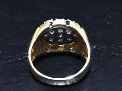 This offering is for an absolutely gorgeous 13 Genuine round Cut Diamonds . About 2.25 carat diamond total weight / Nice Yellow/white gold top diamond cluster of lovely stones. There are 13 approx. .20 ct stones. The ring is set in yellow gold with raised yellow gold accents with white around the stones which show off the nice color and quality of the diamonds. GENUINE Diamond ring set in solid 14k gold. Nice Art Nouveau design!!! Nice clean white diamonds.... H ~ Color / SI1-I1. Florentine finish on the top half with smooth high polish finish by the band section.